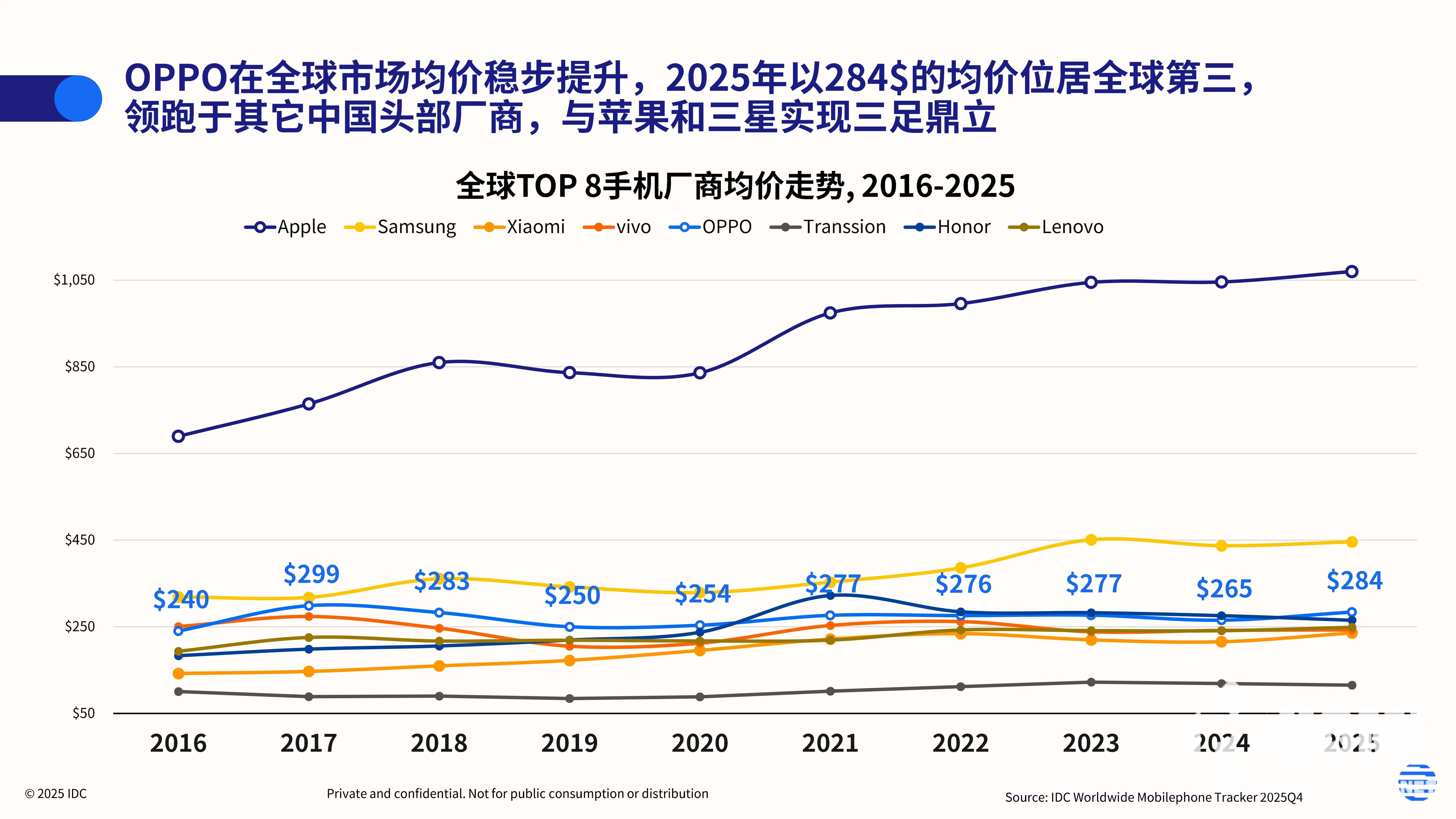 均价是衡量品牌高端化成色最直接的标尺。IDC 数据显示,2025 年 OPPO 全球智能手机均价达 284 美元,在全球出货量 TOP 8 厂商中仅次于苹果与三星,位列第三,同时以显著优势领跑所有其他中国头部手机品牌。