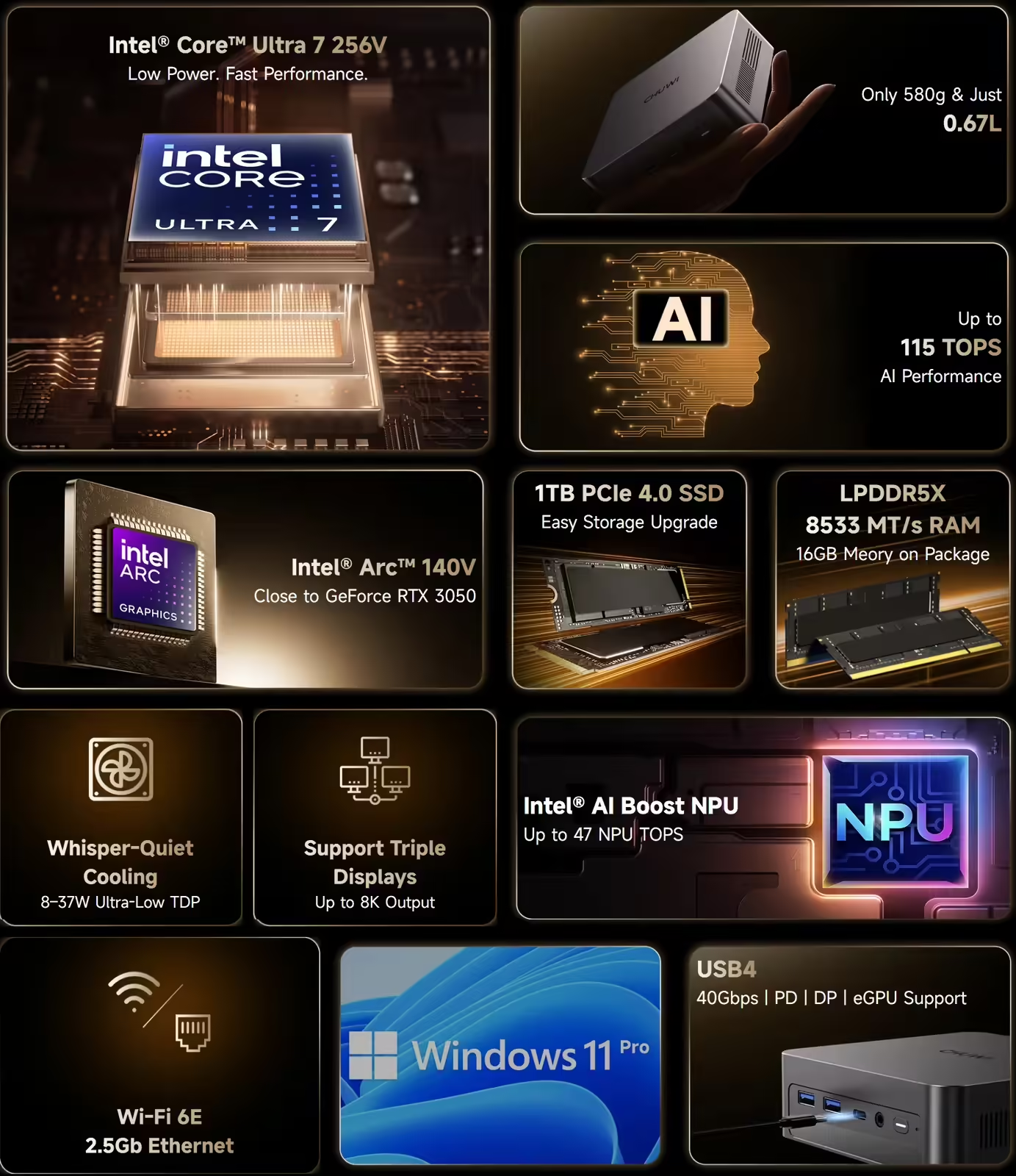 接口与连接能力丰富,支持三屏同步输出,配备2×HDMI 2.1、1×DP 1.4和1×USB4接口;高速传输接口包括5×USB 3.2 Gen1 Type-A、1×全功能USB4(支持100W PD供电)及2.5G网口,同时支持Wi-Fi 6E与蓝牙5.4。机身体积仅0.67升,支持VESA壁挂,便携性突出。
