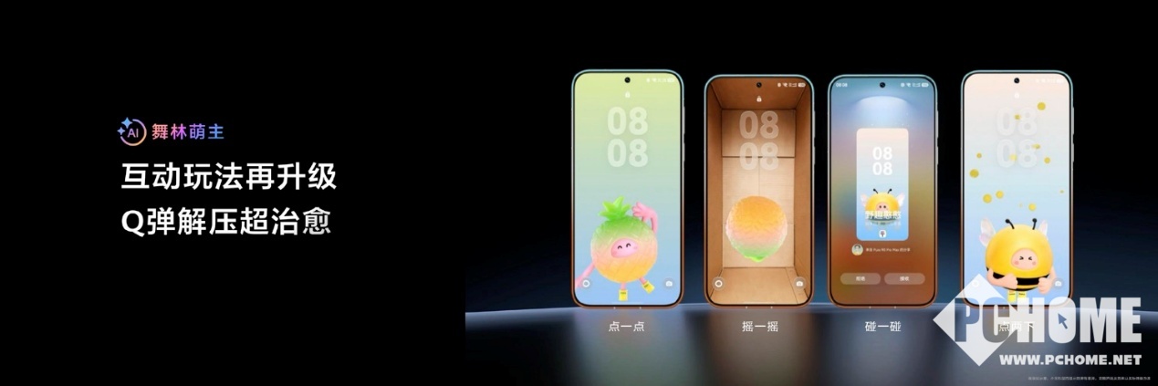 其次,全新上线的舞林萌主此次带来了三款新套装,并拥有更丰富的互动玩法,在锁屏、充电、听歌、切屏等场景均可陪伴左右,对点击、按压、摇动等用户操作均能做出不同互动反馈,比如你在桌面轻点萌主,它还会跟你捉迷藏,情绪价值拉满。同时新增心率检测功能,萌主还会根据心率范围表现出不同的动效反馈。