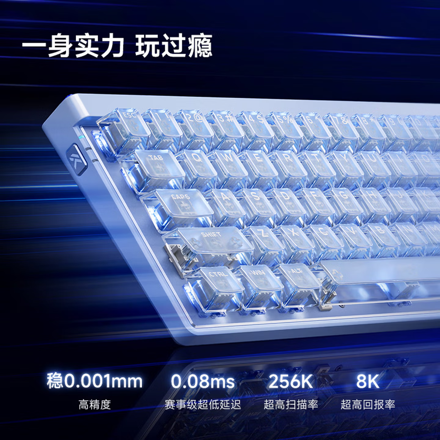 产品核心升级显著,新增独立RT物理按键,可一键切换办公、竞技、极限三种模式,无需进入驱动调整,简化操作流程、提升效率。性能上搭载泰山GT磁轴,支持0.001mm触发精度与0.08ms超低延迟,搭配8K轮询率+256K扫描率,保障电竞高阶操作精准响应;内部采用铝合金定位板与5层声学填充,优化按键声音与手感一致性。