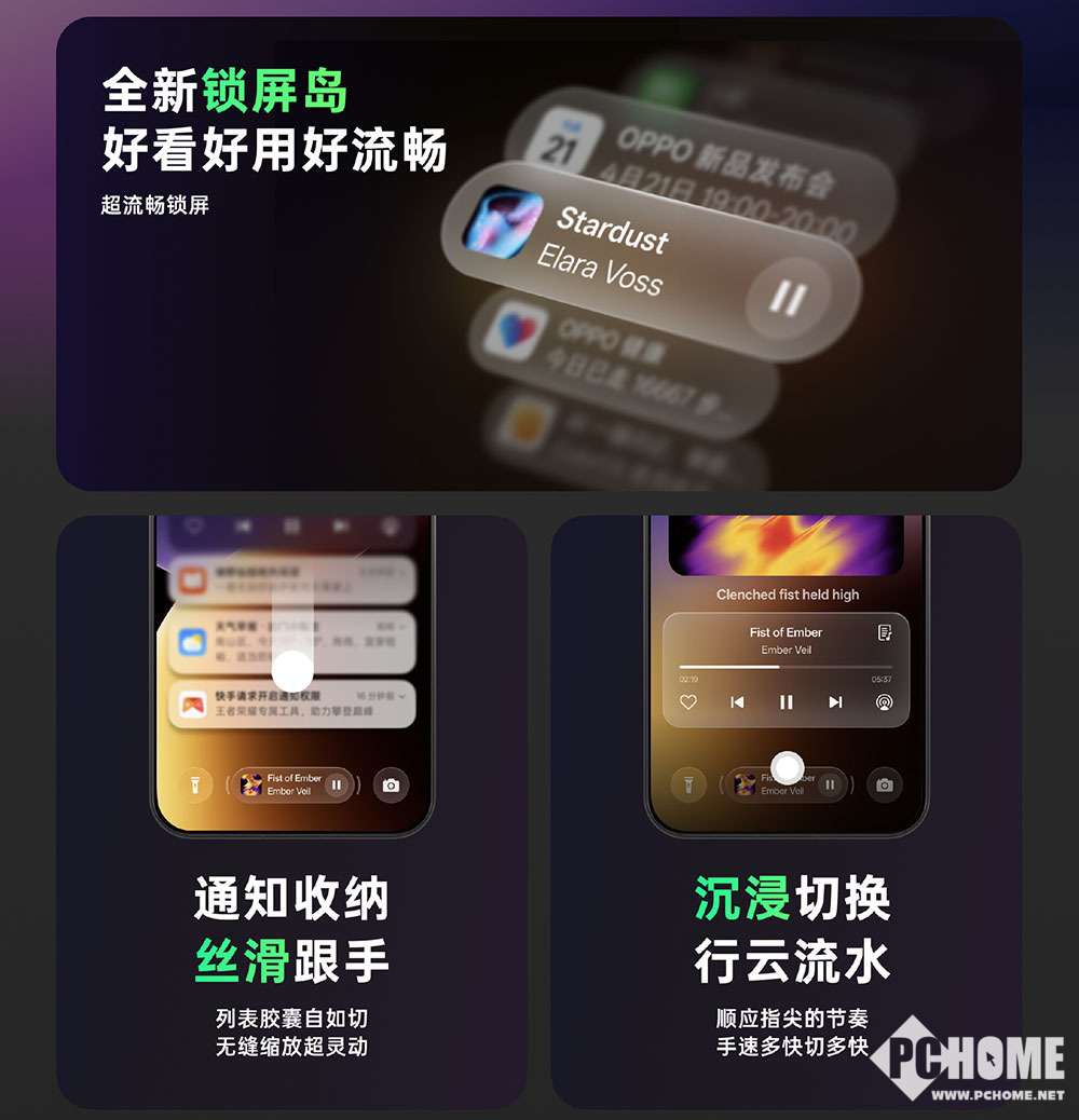 除了导航应用之外,锁屏岛还支持音乐应用以及计时器,音乐应用的胶囊态可以看做是一个播放/切歌的按钮,沉浸态下则支持进度条拖动与歌词实时显示。胶囊态和沉浸态两种形态可上下滑动切换,也可通过左右划动胶囊切换不同应用,切换过程如行云流水,无论你的手速有多快,ColorOS 16都能反应过来。