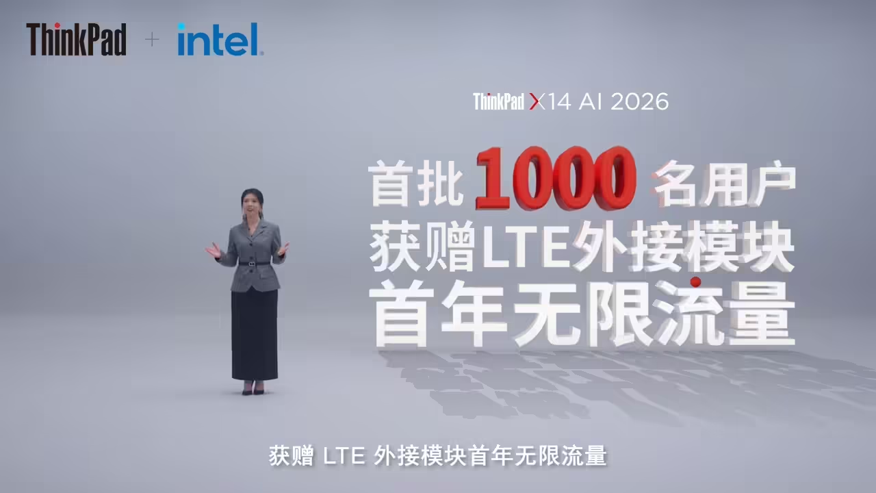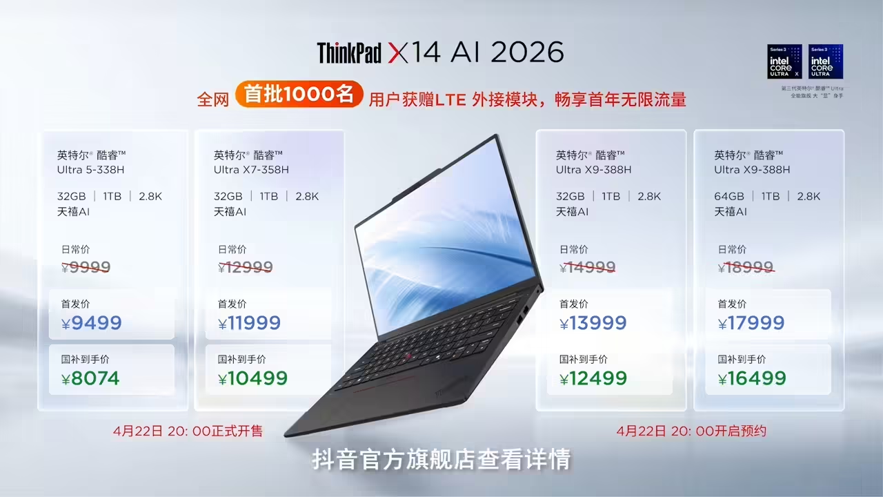 PChome4月23日消息,联想正式推出ThinkPad X14 2026,定位全场景便携AI商旅本,主打1.2kg碳纤维机身、第三代酷睿Ultra处理器与本地化AI功能,政府补贴后8074元起售。
