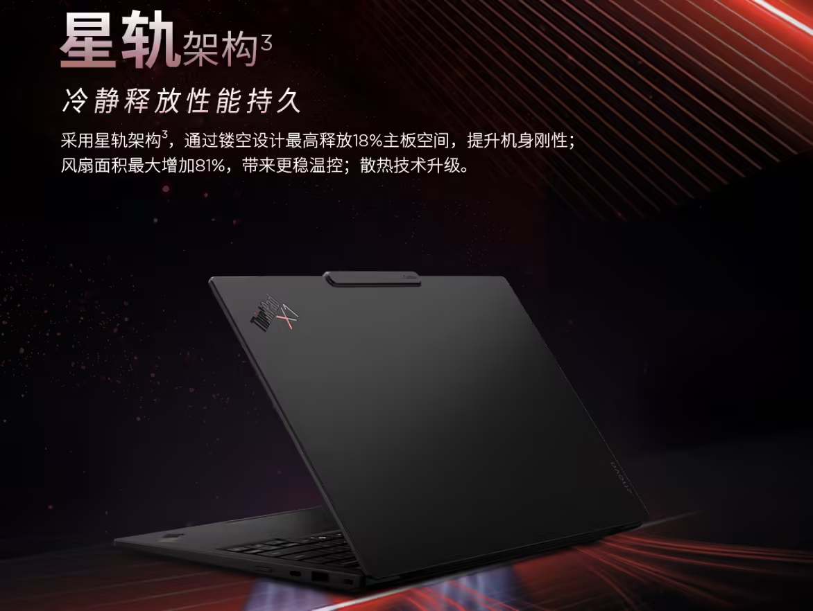 机身采用再生碳纤维A面+再生镁铝合金框架,重量仅984克、厚度14.3毫米,通过12项MIL-STD-810H军工级耐用测试,支持180°开合,轻薄与坚固兼得。性能上,最高搭载英特尔酷睿Ultra X7-358H处理器,16核16线程、睿频4.8GHz,集成50 TOPS算力NPU,可高效加速本地AI任务;首创星轨散热架构,镂空主板释放18%内部空间,风扇面积扩增81%,实现30W稳定性能释放,高负载持久不降频,搭配64GB LPDDR5x内存+2TB PCIe Gen5 SSD,算力与存储拉满。