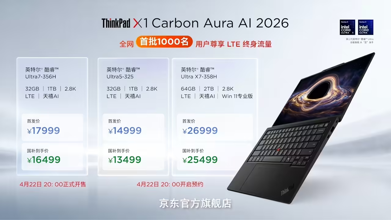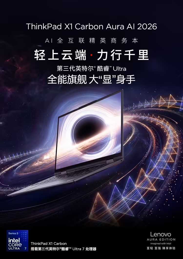 PChome4月23日消息,联想正式发布ThinkPad X1 Carbon 2026,这款定位高端的AI精英商务本,以984克超轻机身、第三代酷睿Ultra处理器与星轨散热架构为核心升级,再度刷新旗舰商务本的体验标准。