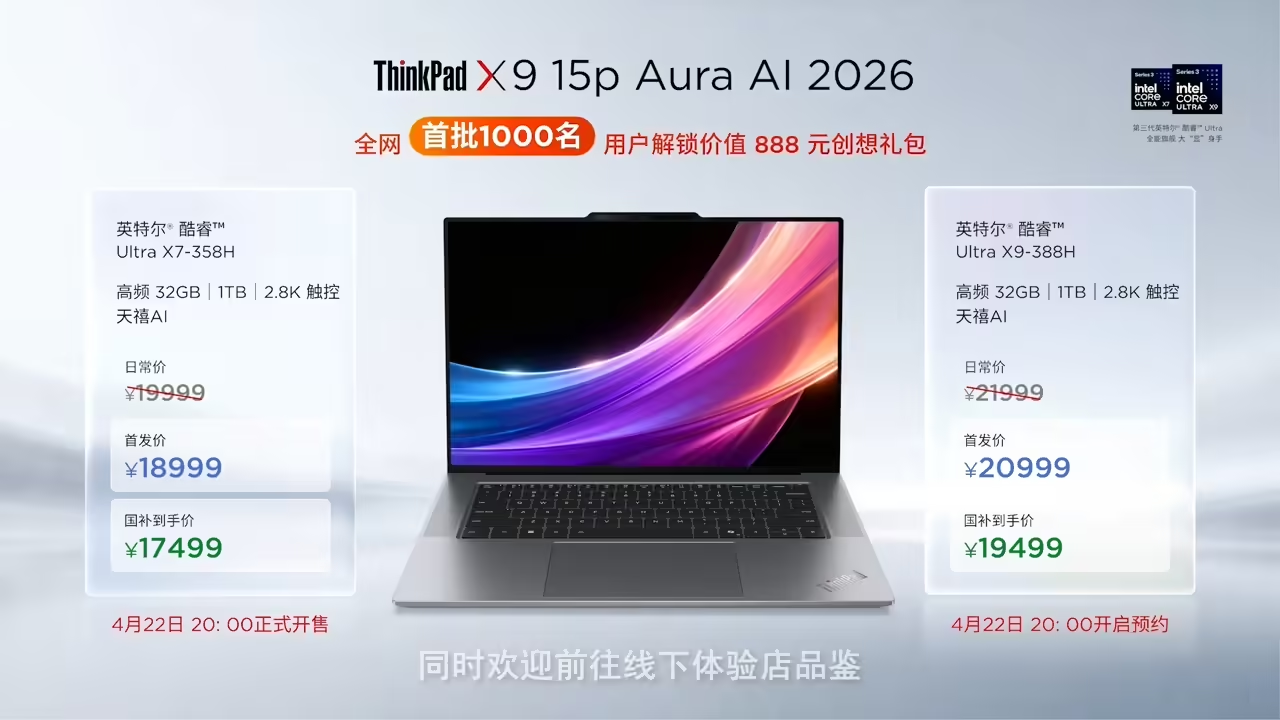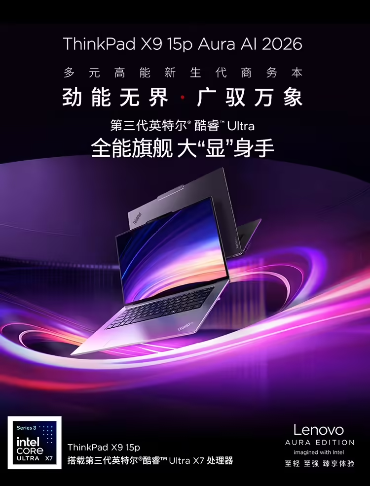 PChome4月23日消息,联想ThinkPad X9 15P 2026正式发布,定位多元高能AI创作本,围绕性能、屏幕、续航实现突破性升级,国行首发价18999元,国补后17499元起。