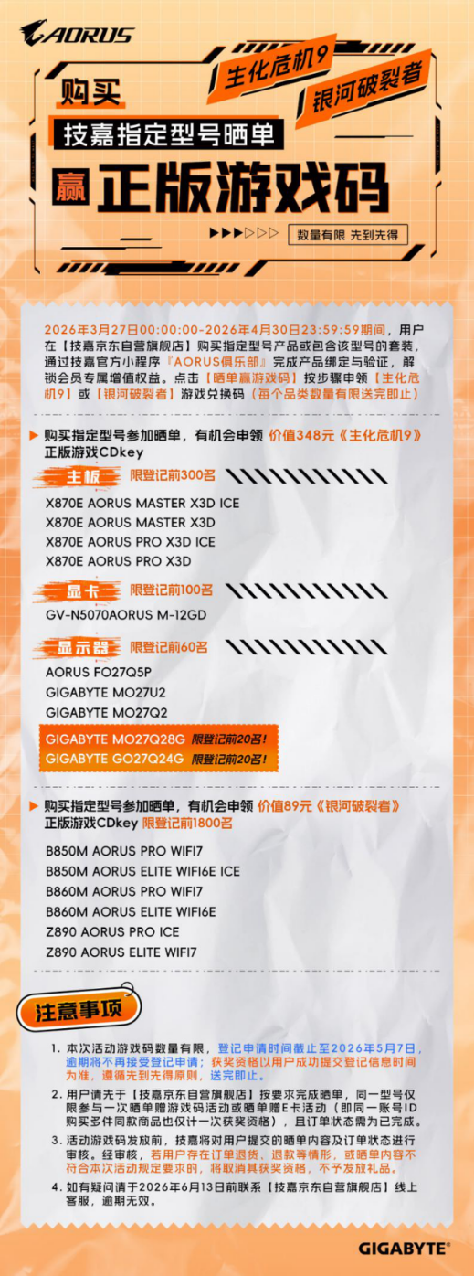 2026年3月27日00:00:00-2026年4月30日23:59:59期间,用户在【技嘉京东自营旗舰店】购买指定型号产品或包含该型号的套装并按要求先晒单,通过技嘉官方小程序「AORUS俱乐部」完成产品绑定与验证,解锁会员专属增值权益。点击【晒单赢游戏码】按步骤申领《生化危机9》或《银河破裂者》游戏兑换码(每个品类数量有限送完即止)。
