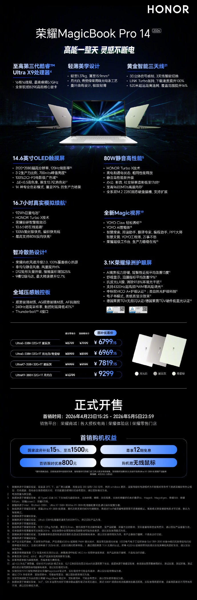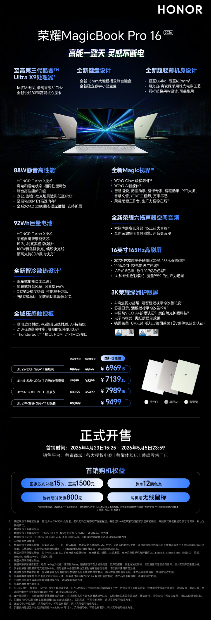性能上,Pro系列最高搭载酷睿Ultra X9 388H处理器,配合HONOR Turbo X技术实现88W满血性能释放;全系标配32GB LPDDR5X内存+1TB PCIe 4.0 SSD,部分机型支持双硬盘位扩展。92Wh大电池带来超长续航,标配100W氮化镓充电器,支持反向快充。