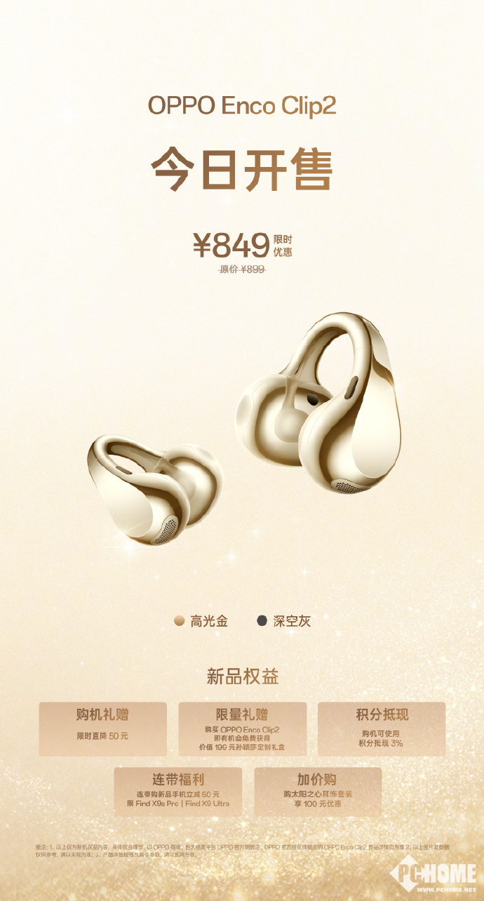 OPPO全新耳夹式耳机——OPPO Enco Clip2今天正式开售,限时优惠价849元,可选择高光金和深空灰配色。