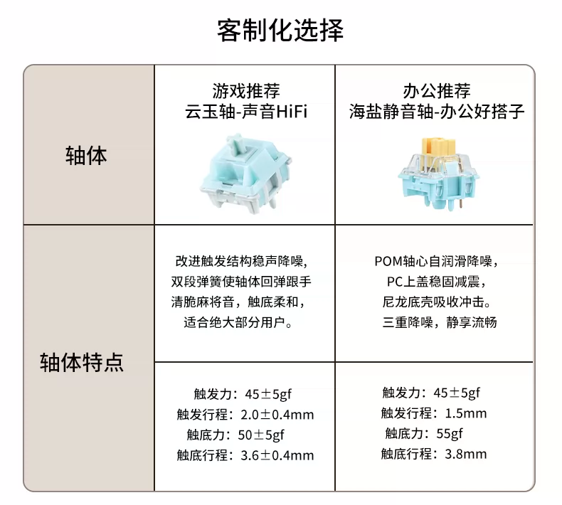 外观采用复古风格机身,以ABS塑料为主体、铝制中框加固,机身前高20.6mm、后高32.4mm,侧边配备多功能滚轮,操控更便捷。首发云玉线性轴与海盐静音轴,可兼顾游戏手感与安静办公需求;键帽采用原厂高度PBT材质,经热升华工艺处理,字符耐磨且不易打油。连接方面支持有线USB-C、蓝牙5.0、2.4GHz无线三模,其中有线与2.4G模式可达1000Hz回报率,蓝牙模式为125Hz;内置5000mAh电池,关灯状态下续航超100小时,长效满足无线使用需求。