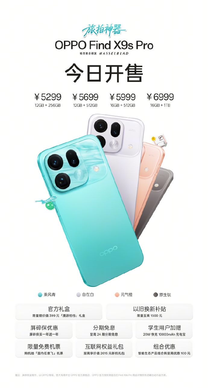 PChome 4月24日消息,超强旅拍旗舰OPPO Find X9s Pro正式全渠道开售,妥妥的全民旅拍神器,影像实力直接拉满。整机主打专业影像配置,搭载哈苏双2亿镜头,覆盖5个黄金焦段,支持8K超清直出,多款质感胶片滤镜随心切换,视频拍摄更是自带专业级能力,日常拍照、短途出游、旅行打卡全都拿捏,综合影像表现无可挑剔。