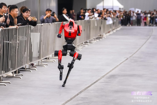 发布会现场,荣耀WIN游戏本正式亮相后,荣耀冠军机器人“闪电”也随后登台,成为全场瞩目的焦点。发布会后,闪电机器人也移步到内场体验区进行展示互动,开启冠军跑——闪电机器人冠军争霸赛,现场明星与媒体嘉宾共同参与,沉浸式体验机器人的卓越性能。