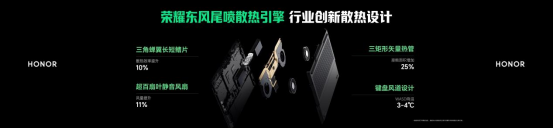 不仅如此,荣耀还集齐三角蝉翼长短鳍片、三矩形矢量热管、键盘风道、超百扇叶静音风扇等硬核散热设计,打造出当前游戏本行业最强散热方案,让玩家一路猛攻。