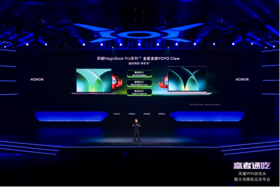 并且,荣耀PC同步完善“性能+AI”双赛道布局,WIN游戏本与以高性能、长续航及全场景AI生产力加持的MagicBook“养虾本”双线突破,构建覆盖电竞、办公、教育、创作的全产品矩阵。凭借差异化定位、同源技术赋能与统一生态体验,荣耀持续强化PC行业领跑者形象,为不同用户提供一站式解决方案。