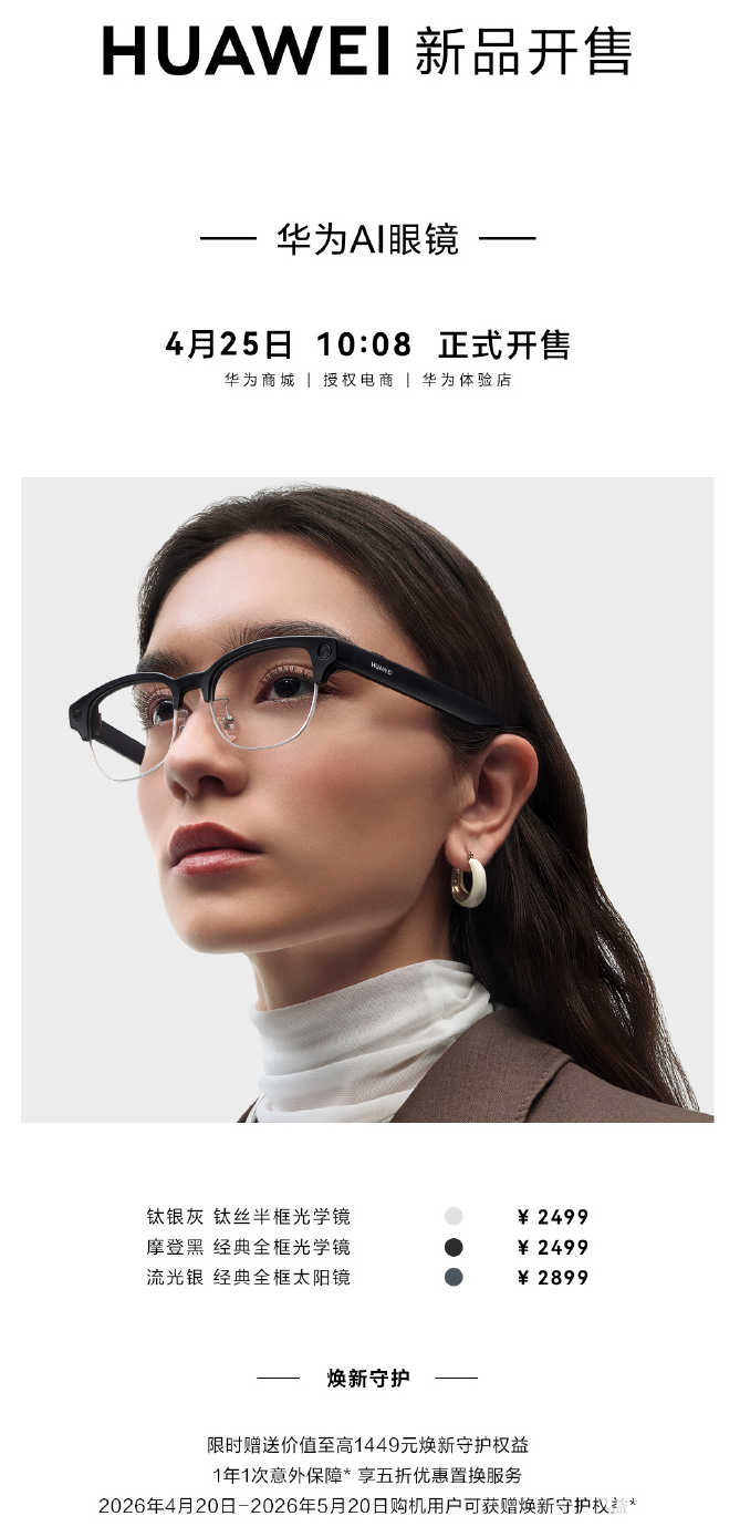 华为AI眼镜今天正式开售,可以选择钛银灰 钛丝半框光学镜、摩登黑 经典全框光学镜、流光银 经典全框太阳镜,起售价2499元。
