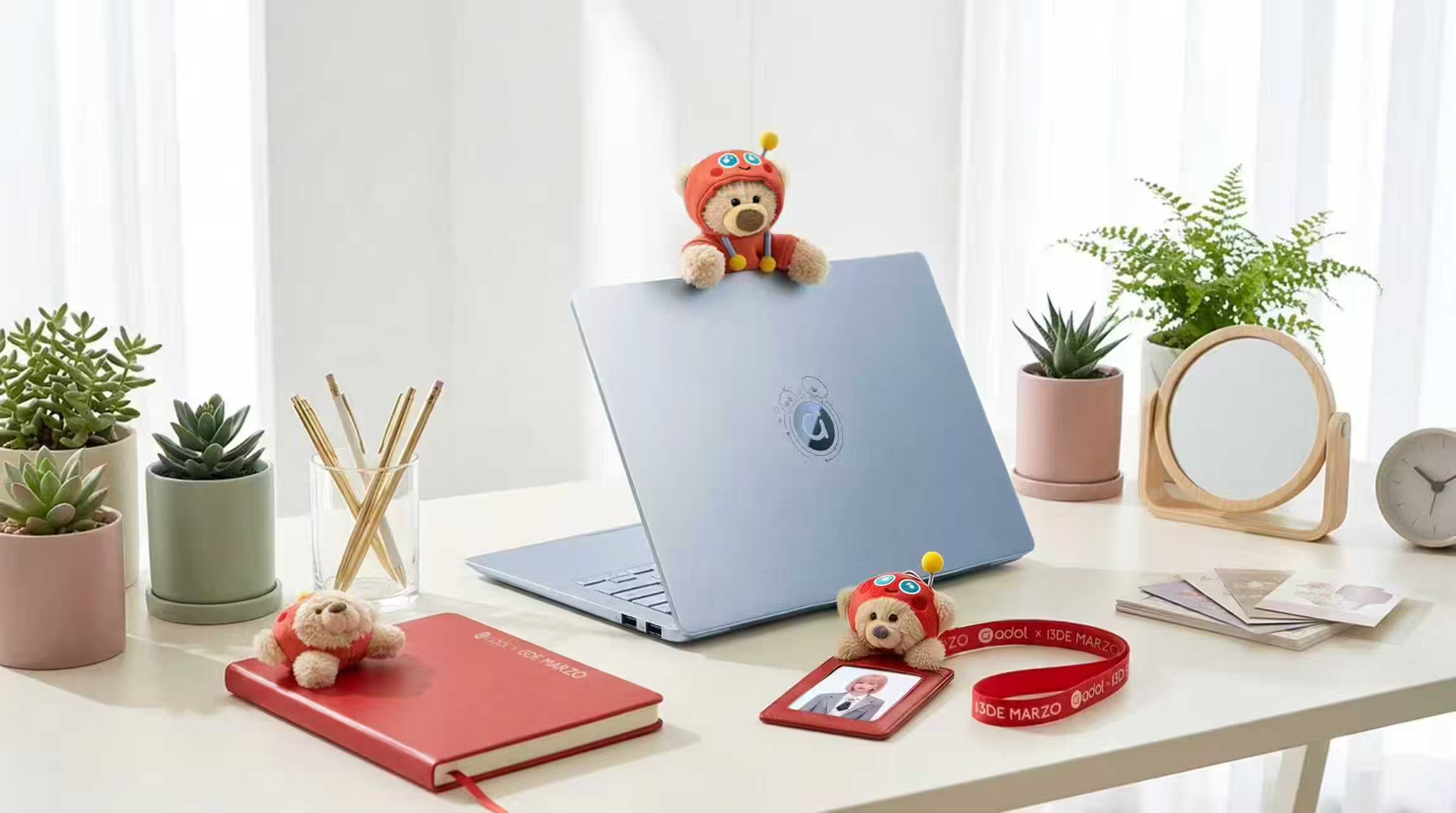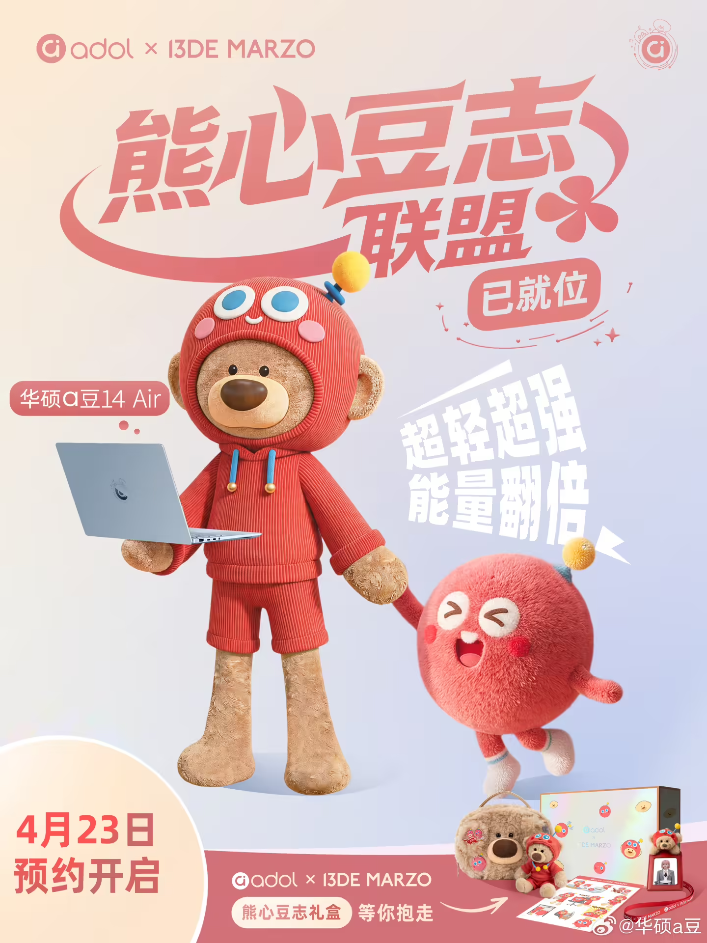 设计上,机身采用风信子蓝配色,A面以镭雕工艺呈现豆叮与MARZO BEAR联名图案,兼具潮流感与治愈感;礼盒含磁吸小熊配件、联名工牌、收纳包及贴纸等限定周边,提升收藏与互动性。便携性升级显著,镁铝合金机身仅14.9mm厚、约990g重,是同配置中最轻机型之一。