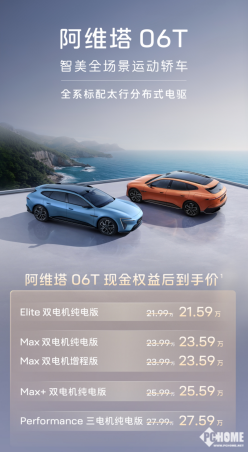 PChome消息,2026年4月22日,阿维塔科技在北京宣布,旗下“智美全场景运动轿车”阿维塔06T正式上市。新车推出纯电与增程两种动力共五款车型,官方售价区间为21.99万元至27.99万元,在限时购车权益后,用户实际到手价为21.59万元至27.59万元。该车型被定位为面向年轻用户的首台性能车,即日起可通过官方App、官网、小程序及线下门店等多个渠道订购,并承诺上市即启动交付。