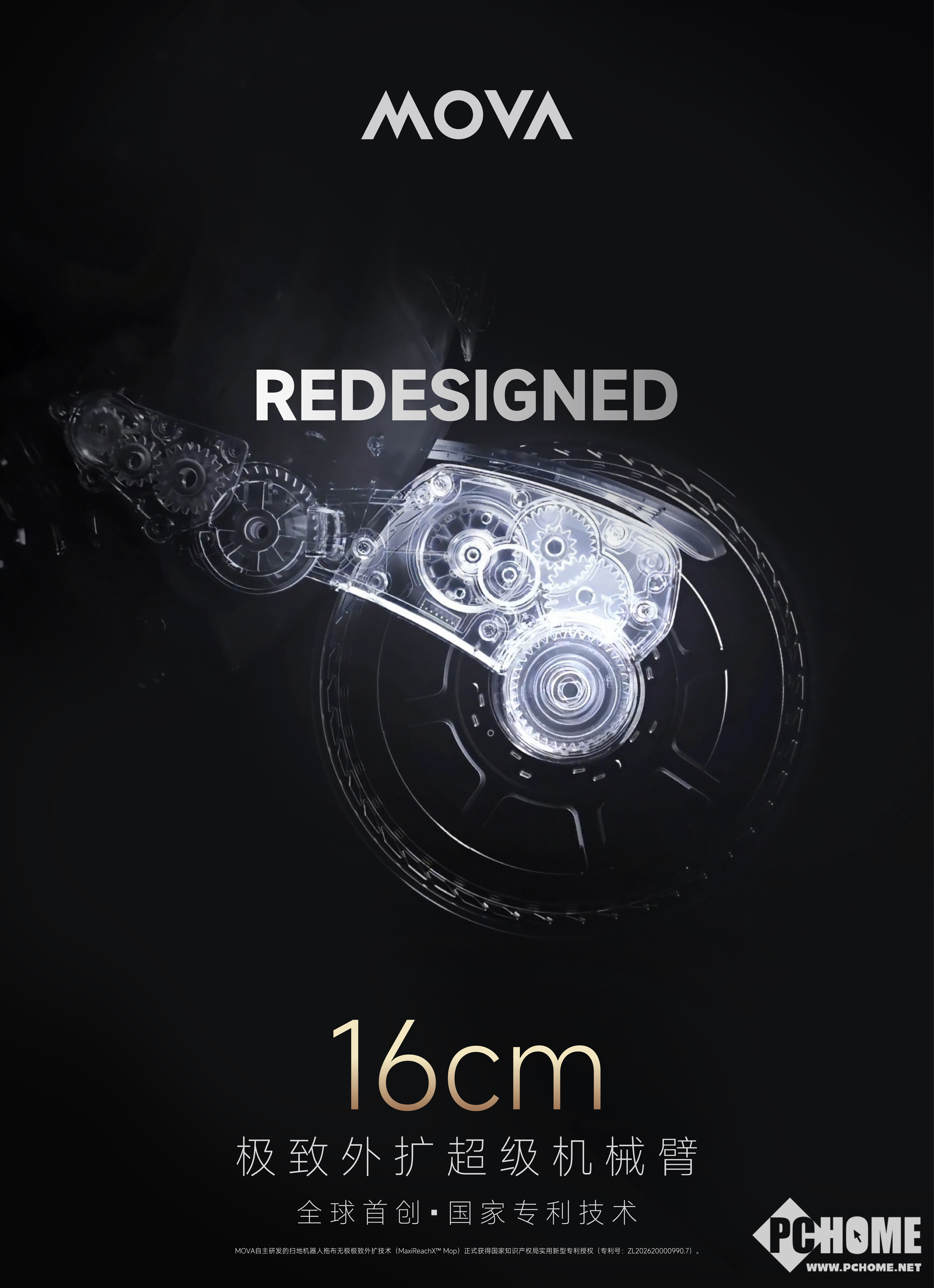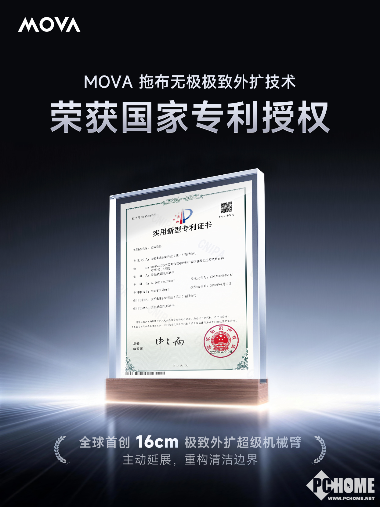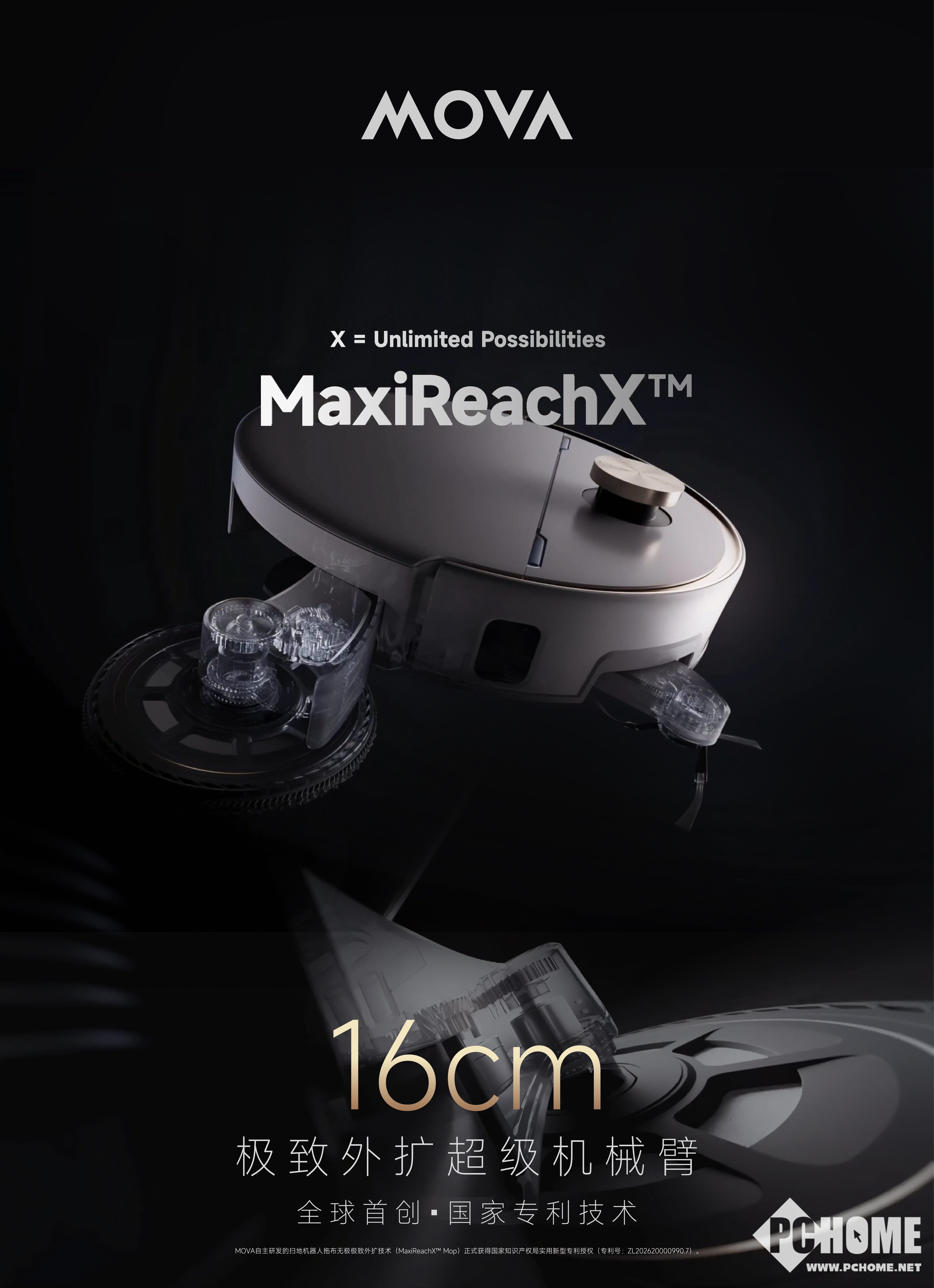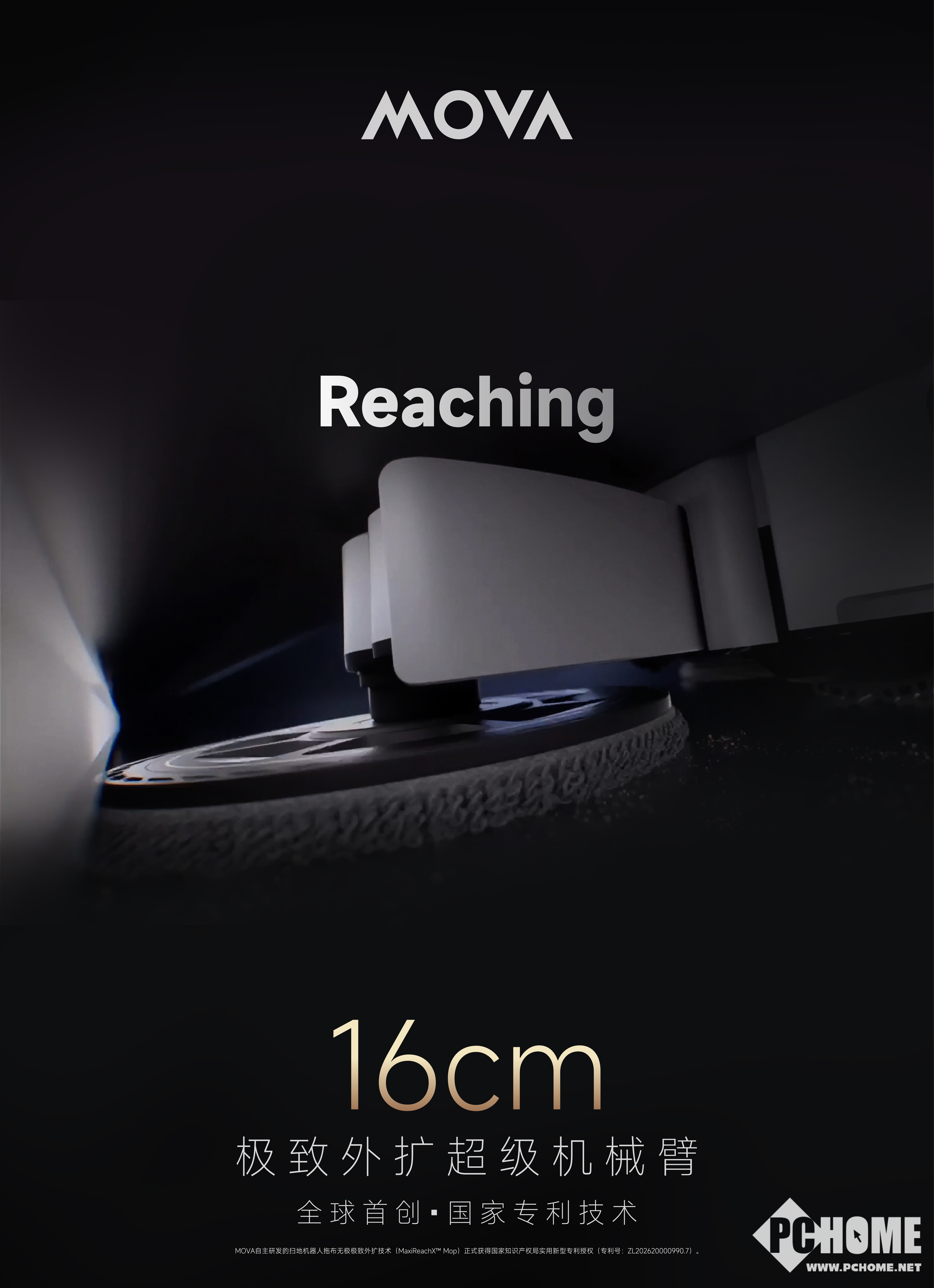 PChome消息,近日,全球高端创新智能家电品牌MOVA自主研发的扫地机器人拖布无极极致外扩技术(MaxiReachX™ Mop)正式获得国家知识产权局实用新型专利授权(专利号:ZL202620000990.7)。该技术以全球首创的16cm极致外扩超级机械臂为核心,首次在扫地机器人领域建立了可脱离机身限制进行地面清洁的技术路径,使扫地机器人的清洁方式从“机身进入空间”转向“清洁结构主动延伸进入空间”,让清洁单元不再受限于整机尺寸。