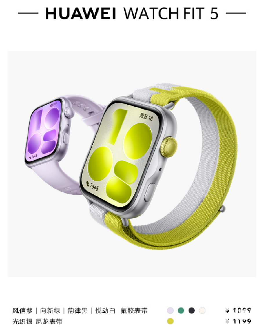 PChome 4月29号消息,华为全新智能手表华为WATCH FIT 5今天正式开售,可选择包含风信紫、向新绿、韵律黑、悦动白在内的四种配色的氟胶表带,以及光织银的尼龙表带。