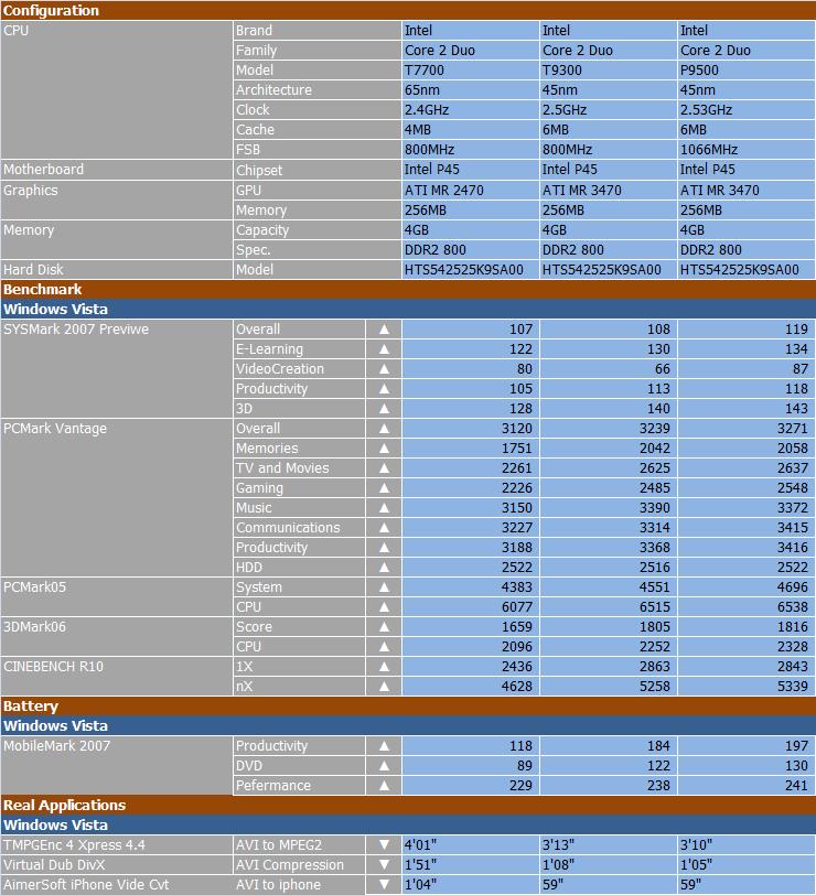 我们所使用的测试平台的基本配置为:Intel PM45芯片组、4GB DDR2 800内存、ATI Mobility Radeon 3470显示芯片和容量为250GB的高转速硬盘。上面提到的所有测试成绩均可以从下面的表格中一览无遗。