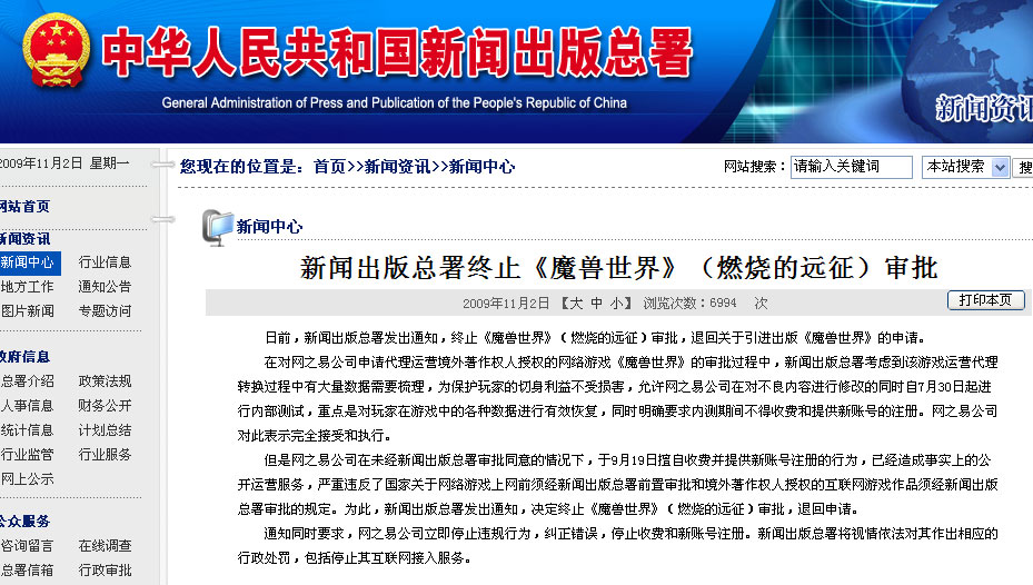 近日,新闻出版总署网站刊出消息终止《魔兽世界》(燃烧的远征)审批,消息一经发布,立刻引起业内各界人士的关注,对此的看法也是纷杂不一。本站记者也一直关注着此事的最新进展,并对网上各方观点进行了汇总,希望能给关注此事的玩家朋友们提供一些有用的信息。
