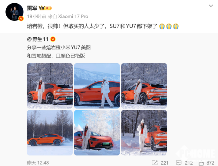 一位汽车博主分享的熔岩橙小米YU7美图引发关注,雷军转发并连发三个泪目表情。表示该经典配色因敢买的人太少,SU7和YU7均已下架