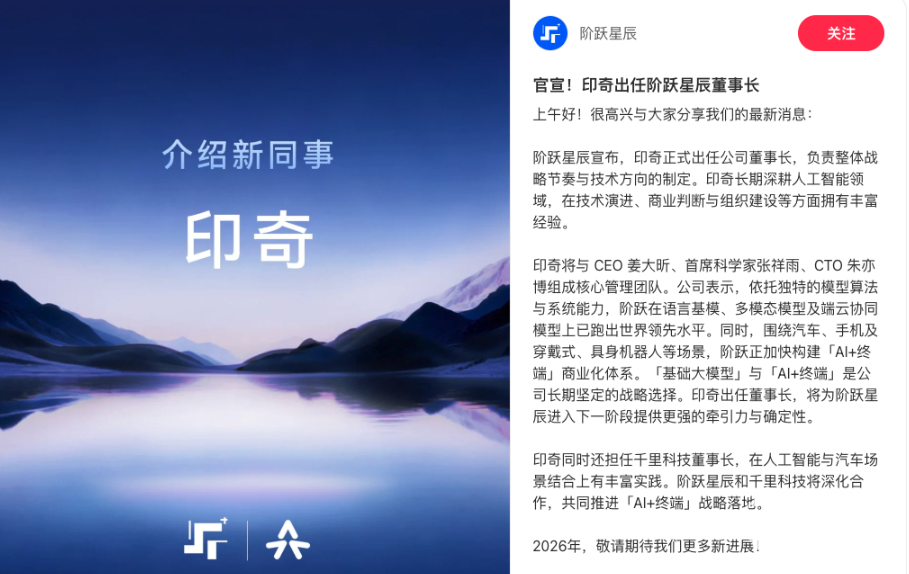 2026年1月26日,千里科技董事长印奇将出任大模型公司阶跃星辰董事长,同时继续担任A股上市公司千里科技董事长。