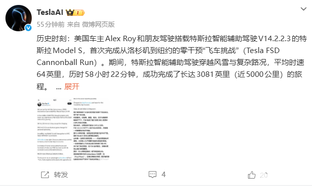 1月26日消息,特斯拉官方微博今日发文宣布,美国车主Alex Roy和朋友驾驶搭载特斯拉智能辅助驾驶V14.2.2.3的特斯拉Model S,首次完成从洛杉矶到纽约的零干预“飞车挑战”(Tesla FSD Cannonball Run)。