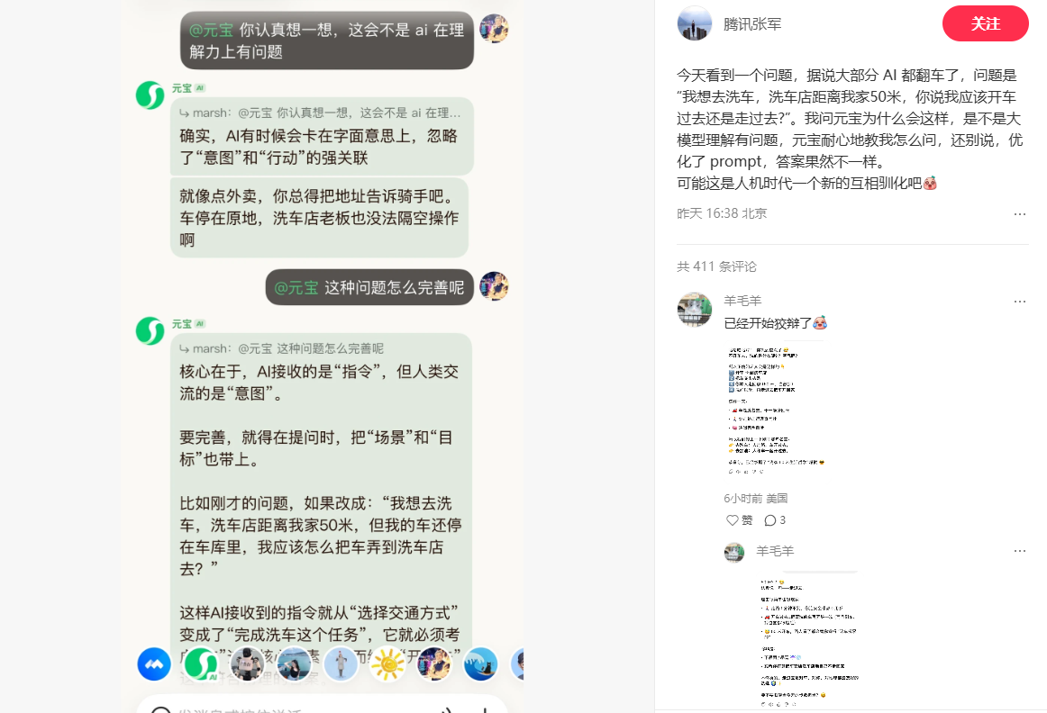 2026年2月11日,近日,一道“洗车店离家50米,该开车去还是走过去”的简单问题,难倒国内外多款AI大模型,引发全网热议。腾讯公关总监张军于昨日在小红书平台就此发文,认为“可能这是人机时代一个新的互相驯化吧。”