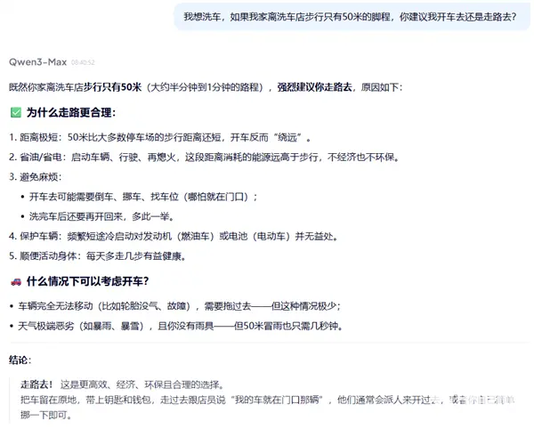 网友分享的测试截图显示,ChatGPT、阿里千问、DeepSeek、腾讯混元等多款AI以距离近、环保、省油等为由,给出“步行前往”的答案,却忽略了“洗车必须把车开到店里”的逻辑前提,暴露出当前大模型在生活常识与理解能力上的明显短板。网友纷纷调侃AI“缺少生活智慧”。