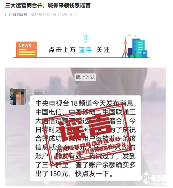 2026年2月24日消息,近日多地微信群出现“中国移动、中国联通、中国电信三大运营商合并”“转发消息可领现金红包”等不实信息,引发关注。对此,“山西网络举报”公众号今日发文明确表示该消息纯属谣言。