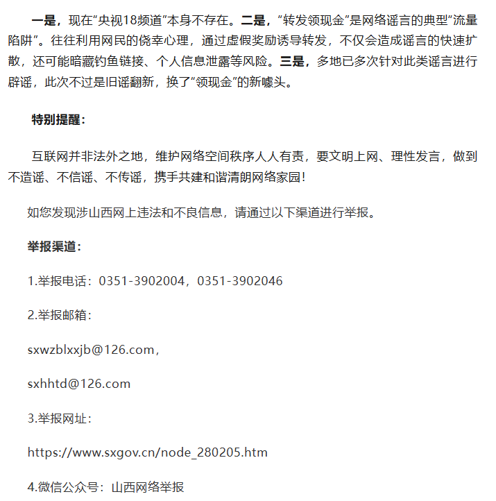 此传言声称消息源于“中央电视台18频道”,经官方核实,三大运营商合并一事纯属编造,工信部与三大运营商均未发布过合并公告,也无相关改革计划。所谓“央视18频道报道”“转发领50元”均为谣言套路,属于利用网民侥幸贪利心理展开诱导扩散的典型网络谣言。官方提醒,此类通过虚假奖励诱导转发的行为,不仅会造成谣言的快速扩散,还可能暗藏钓鱼链接、个人信息泄露等风险。