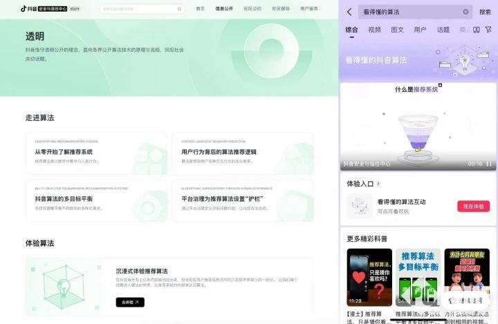算法透明化是抖音长期坚持的方向。去年3月,抖音安全与信任中心官网上线,全面公开抖音算法原理,对公众关切的问题逐一解答,不到一年时间,网站访问量已突破200万次。此外,2026年1月,抖音宣布将进一步做好算法透明,持续公开推荐算法运作原理、运营机制,增强算法的可理解性。此次上线的“体验算法”板块,就是抖音在算法公开、助力公众算法素养提升方面做出的又一次创新性尝试。