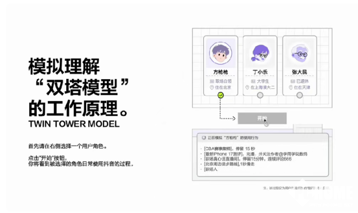 PChome获悉,本次“体验算法”板块的最大特点是可视化、可互动,不懂技术的小白也能看懂。用户可通过抖音安全与信任中心官网,或在抖音APP搜索“看得懂的算法”关键词进入体验。小程序将复杂技术通俗化,完整展示召回、排序、随机扰动三大核心环节:通过双塔模型完成内容初筛,依托 Wide&Deep 模型进行打分排序,结合兴趣时钟适配时段偏好,并以随机扰动机制拓展内容多样性,避免信息茧房。