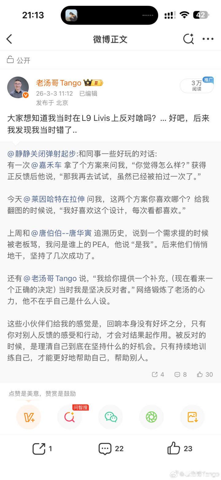 PChome 3月7日消息,近日,理想汽车产品线负责人汤靖发文称:曾公开表示,在研发全新一代理想L9初期,他最反对的配置就是搭载800V高压平台和5C超充技术,认为增程车型配备超充系统成本过高且必要性存疑。