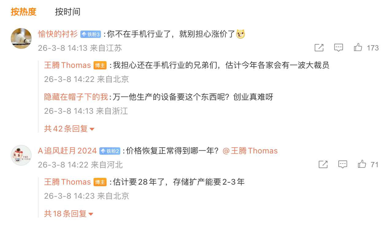 值得注意的是,王腾还在评论区和网友互动称,“我担心还在手机行业的兄弟们,估计今年各家会有一波大裁员”。王腾预测,存储扩产能要2-3年,所以内存价格恢复正常预计要等到2028年。