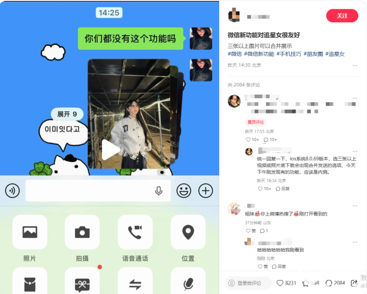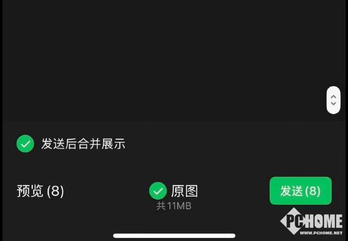 PChome 3月18日消息,昨日,据用户分享,微信正于iOS端小范围灰度测试“折叠发图”新功能,多张图片可以合并发送,解决刷屏问题,引发用户广泛关注。