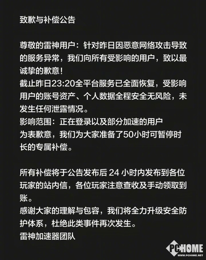 PChome 3月23日消息,雷神加速器因3月21日遭遇恶意网络攻击导致服务大规模中断,已向受影响用户发放50小时可暂停时长补偿,并承诺升级安全防护体系。