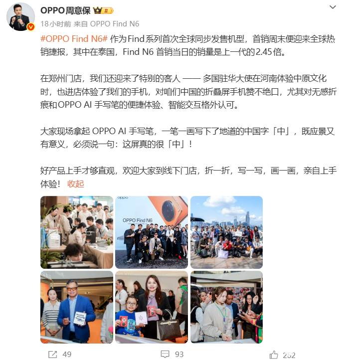 PChome 3月23日消息,OPPO Find产品负责人周意保于昨日公布,OPPO折叠旗舰Find N6在泰国首销日的销量达上一代2.45倍,国内亦创下近一年全品牌、全形态折叠屏产品首销日全新纪录。