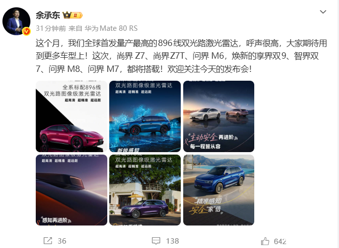 此外,余承东还表示,问界M6,焕新的享界双9、智界双7、问界M8、问界M7,也将搭载这一激光雷达。