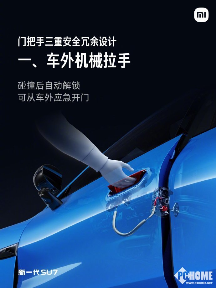 PChome 3月23日消息,小米集团创始人雷军于昨日发文透露,新一代小米SU7车门把手配备机械拉手,并采用三重安全冗余设计,即便动力电池与低压小电池同时断电,仍能正常打开车门,全面符合2027年新国标。