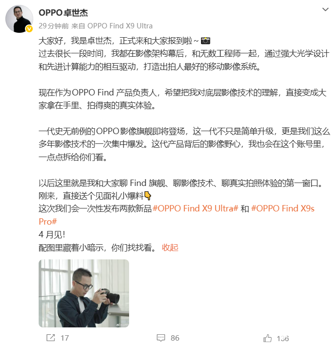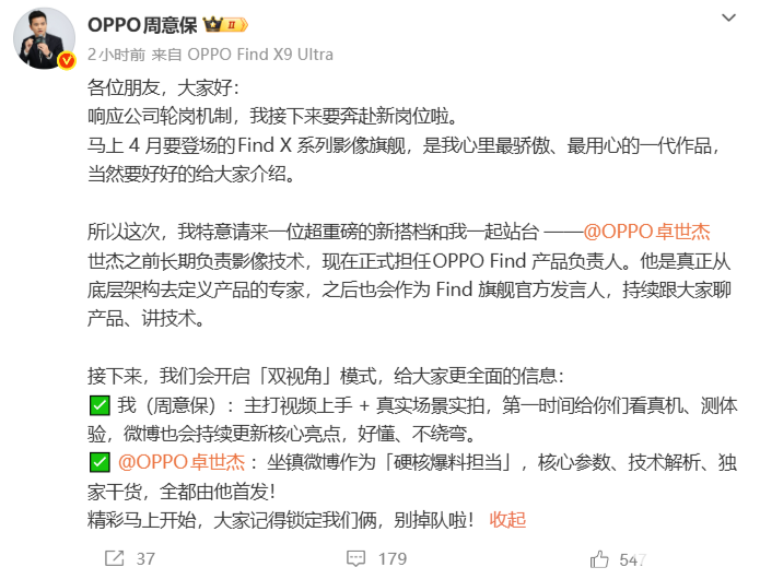 周意保在博文中提到,即将于4月发布的Find X系列影像旗舰(网传Find X9 Ultra)是他“最骄傲、最用心的一代作品”,因此邀请长期负责影像技术的卓世杰共同站台,后续两人将以“双视角”模式为公众逐步揭晓产品信息。