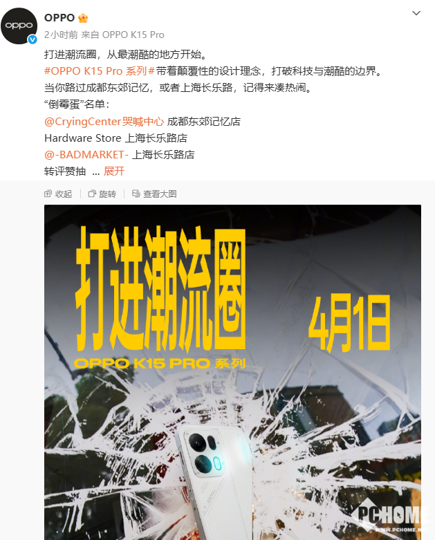 PChome 3月26日消息,OPPO K15 Pro系列已正式官宣将于2026年4月1日发布,本次发布会主题定为“冷酷科技”,主打极致性能与散热体验,旨在打入潮流电竞圈 。