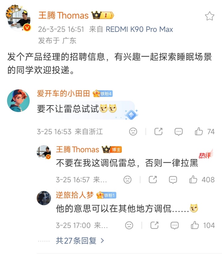据PChome了解,有网友在评论区提议“要不让雷总试试”,王腾直接警告:“不要在我这调侃雷总,否则一律拉黑”。该回复被迅速传播,话题#王腾警告调侃雷军一律拉黑#登上热搜。多数观点认为,王腾离开小米后仍公开维护雷军,凸显其重情义品格,此前,王腾曾从小米基层晋升至Redmi品牌及中国区市场部双总经理,雷军、卢伟冰为其提供大量资源与成长机会,网友指出其睡眠科技初创公司“今日宜休”处于0-1阶段,事务繁杂,此时仍强硬护主更显真诚。