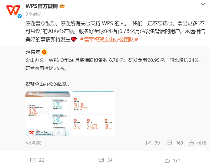 PChome 3月26日消息,今日,小米集团创始人雷军在微博发文,披露了金山办公的两项优异成绩并致以祝贺。金山办公随后转发其微博并表态将持续深耕AI办公领域,为全球用户提供更好的服务。