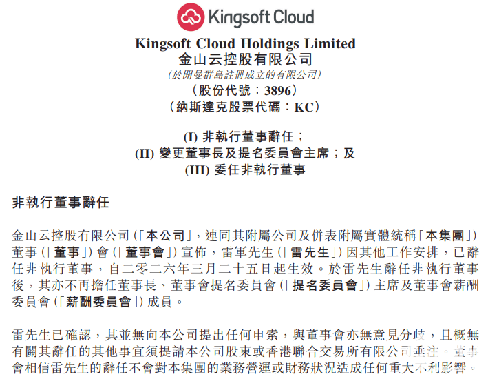 公开资料显示,雷军于1992年加入金山软件有限公司,并担任金山软件多个高级职位;自2015年4月起,担任金山云控股有限公司董事长。3月25日,金山云在港交所发布公告,宣布雷军因其他工作安排,已辞任非执行董事。此次公开祝贺被视为对团队战略坚守与技术突破的高度认可。