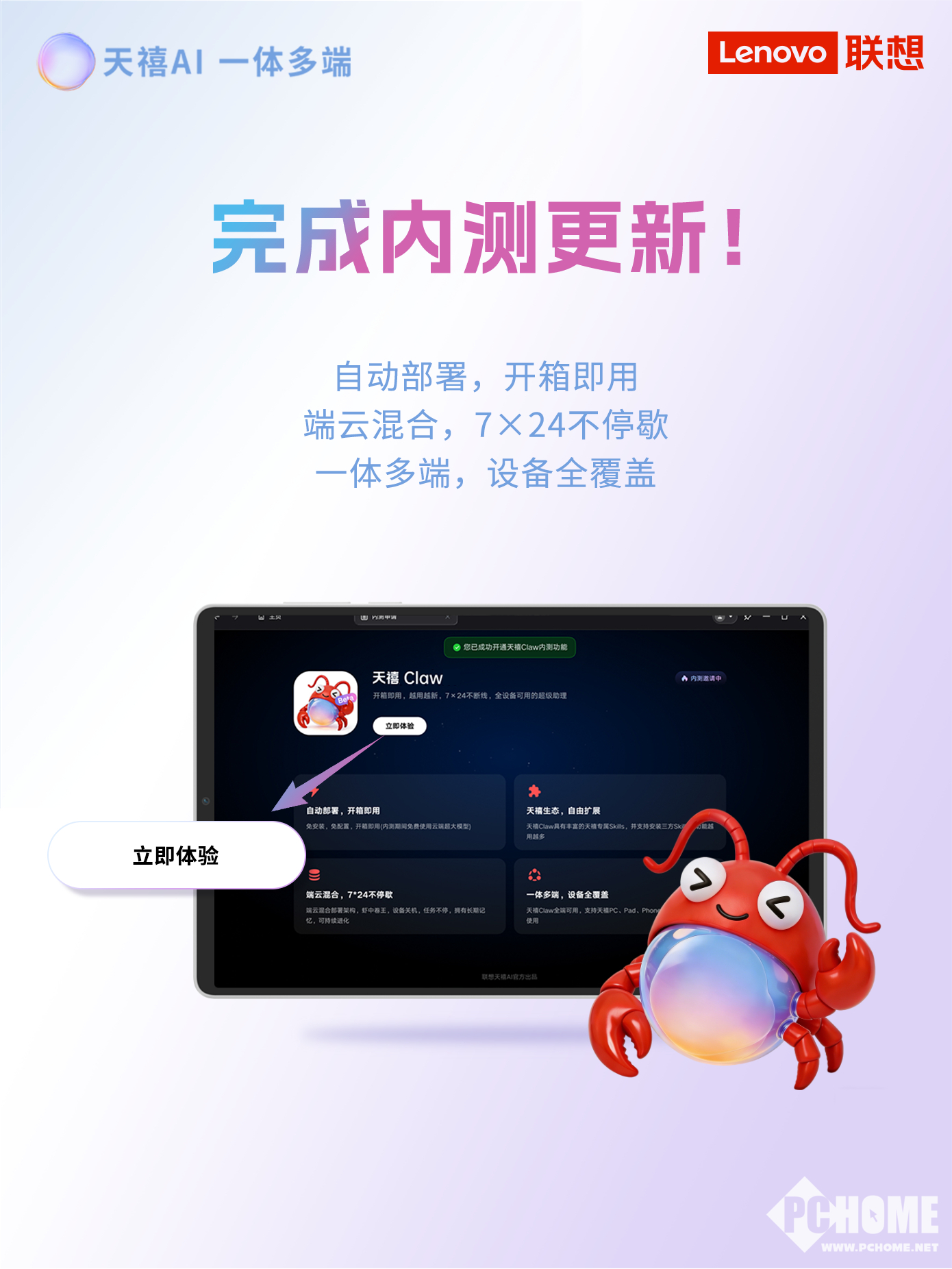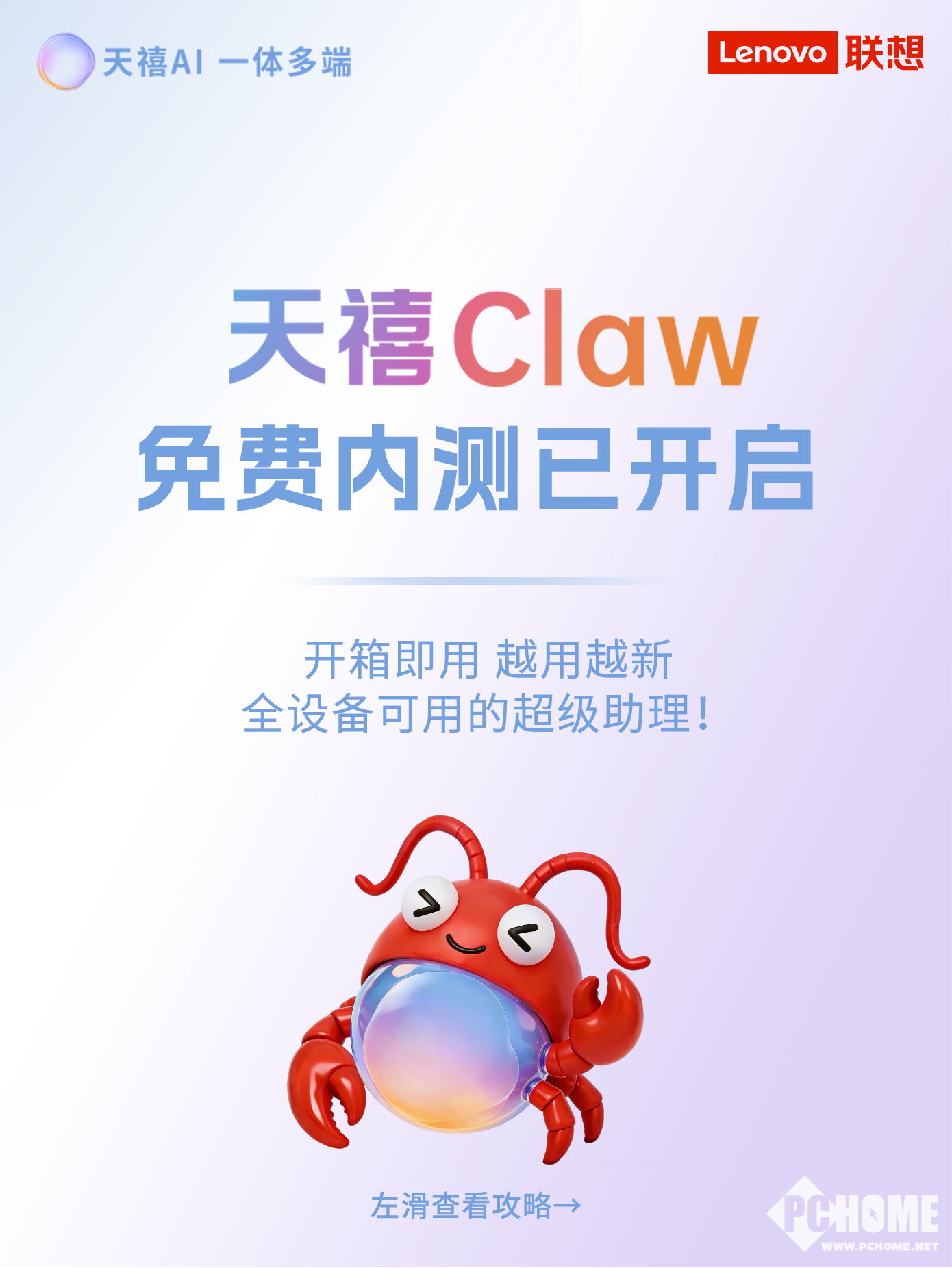PChome 3月31日消息,联想“龙虾”天禧AI Claw内测于昨日 正式启动,用户在内测期间可免费使用云端超大模型,主打“零部署门槛+多端协同执行”。