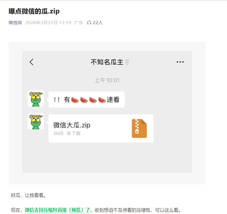 PChome 3月31日消息,微信官方公众号“微信派”今日宣布,微信上线压缩包直接预览功能,用户无需下载、无需解压,即可查看压缩包内容。