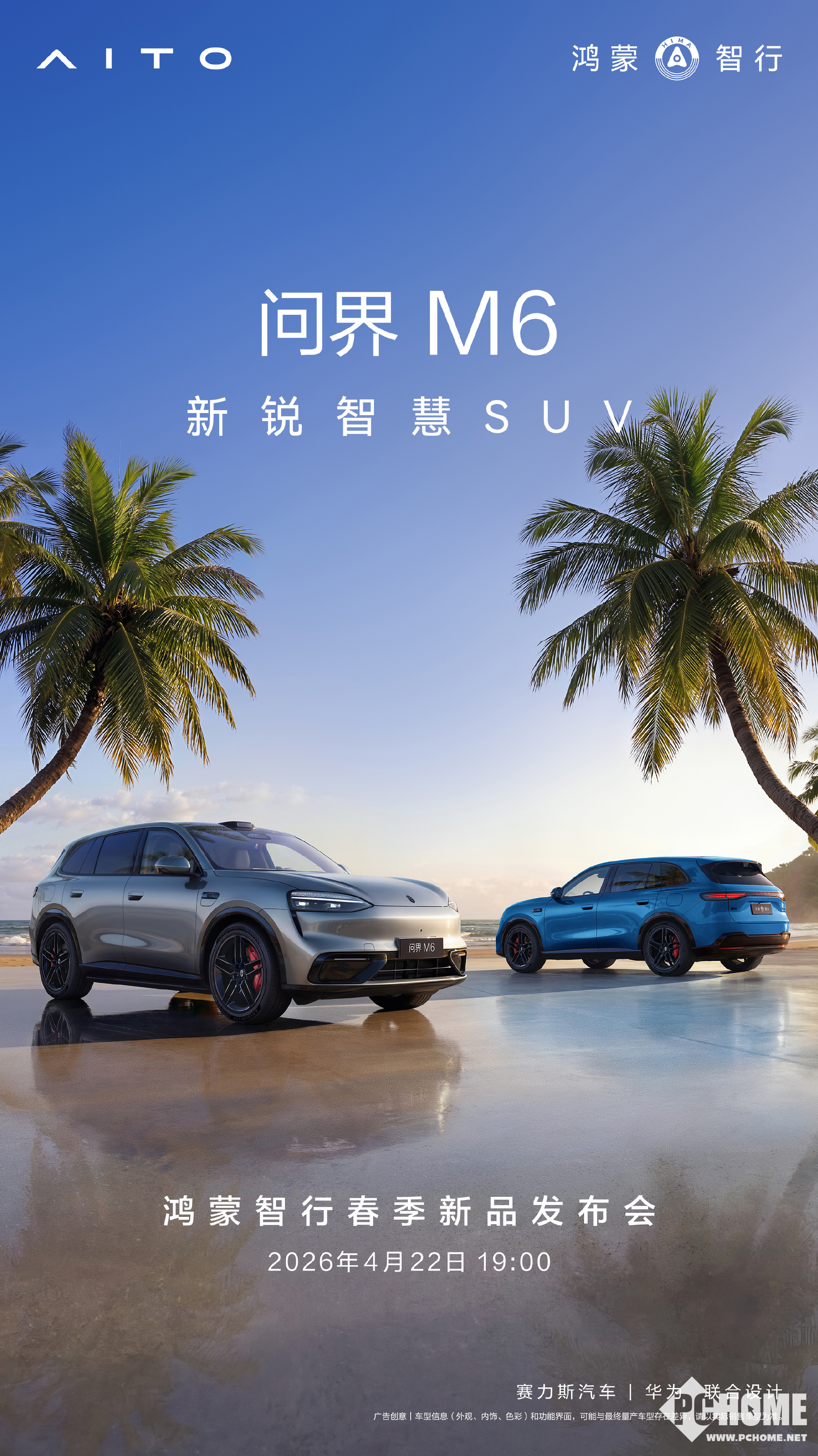 PChome 4月15日消息,鸿蒙智行官微发文称,4月22日19:00举办的鸿蒙智行春季新品发布会上,将推出新锐智慧SUV问界M6。