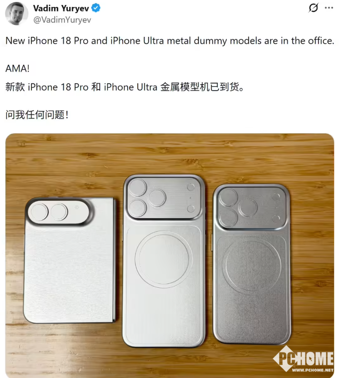 PChome 4月23日消息,消息源@VadimYuryev今日在X平台发布推文,分享了一组金属机模照片,展示了苹果iPhone 18 Pro和iPhone 18 Pro Max,并对比了现有的iPhone 17 Pro Max。