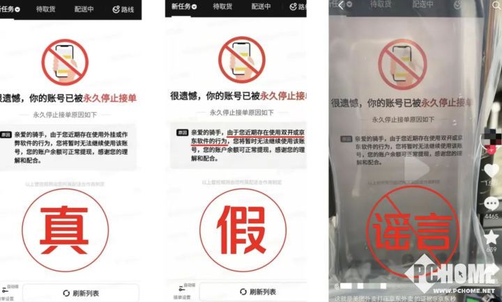 首先,“因使用双开或京东软件,被永久停止接单”系恶意P图造谣。此前美团曾澄清“去其他平台跑单会被美团永久封号”的谣言,然而社交平台又现骑手App显示“永久停止接单原因为:存在使用双开或京东软件的行为”的谣言图片。经核实,该图片由平台封禁违规抢单外挂的正常提示页恶意P图而来,图中“双开”等字体变造痕迹明显。目前,美团已固定证据,将通过法律手段维权,并加大对恶意账号及幕后推手的打击力度。